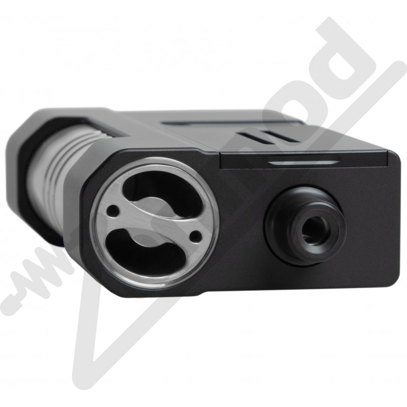 На лицевой стороне Aspire BOXX Deluxe Version расположена кнопка «FIRE» и клавиши для регулировки мощности. Монохромный экран находится на нижней грани устройства, что довольно необычно, но переживать не стоит – он слегка утоплен в корпус, так что царапаться не должен. На боковой грани имеется небольшая крышка-слайдер, под ней прячется картридж, который дополнительно фиксируется дриптипом. Чуть ниже имеется сквозное отверстие для забора воздуха – выглядит очень нестандартно. Сверху видим крышку на резьбе, она открывает доступ к аккумуляторному отсеку и имеет крупные прорези для вывода газов.